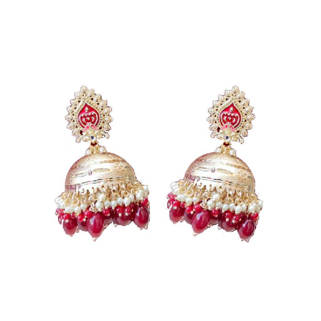 Beautiful jhumka earrings in dull golden tone with bead drops in rich red. These are gold-plated alloy Jhumka earrings featuring Kundan work, red Meenakari enamel, and hanging beads.