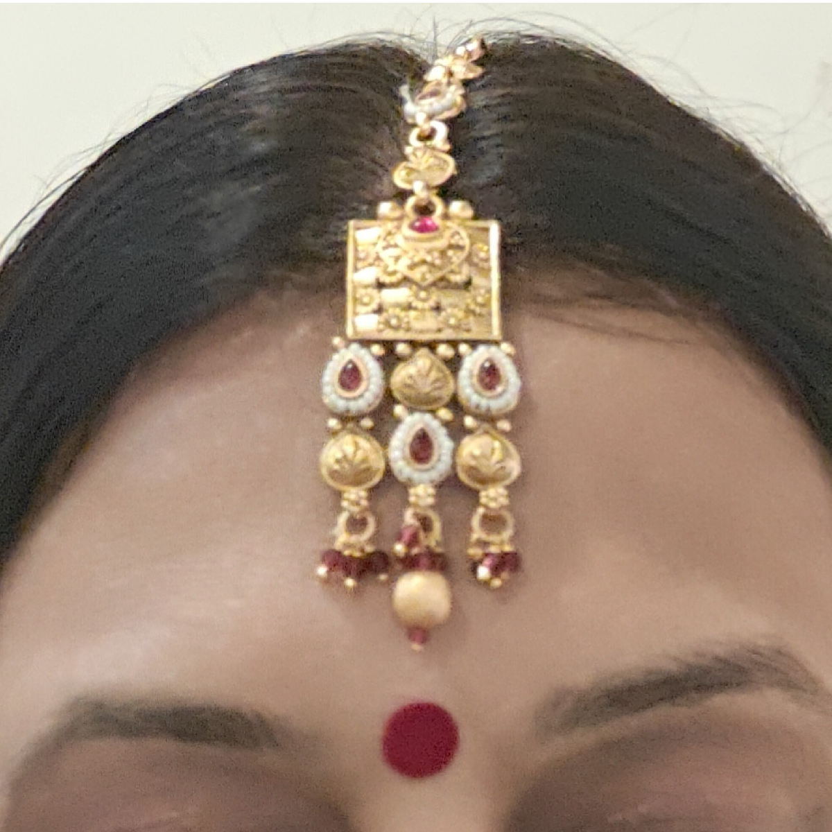 Elegant and pretty Golden Necklace Set with Maang Tikka. Triple layered necklace set in gold touch with intricate bead work.