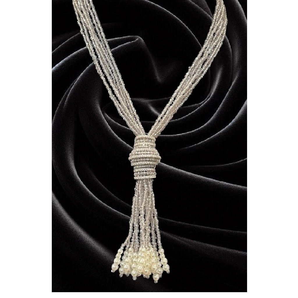 Long stylish multi strand necklace with tassel in pearl ring. This striking multi string necklace features faceted beads stone strings. Available in carbon Black and Off White options.