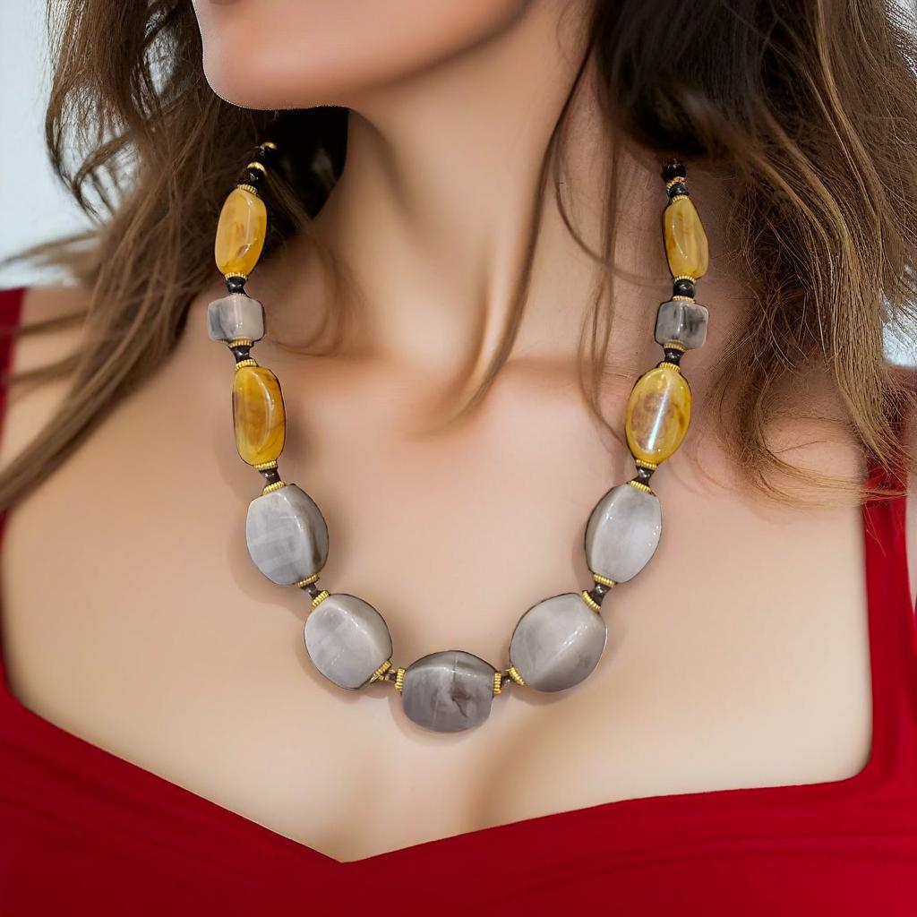 Mustard and grey beaded necklace in Collar Length.Stylish fusion necklace in beautifully coordinated colours