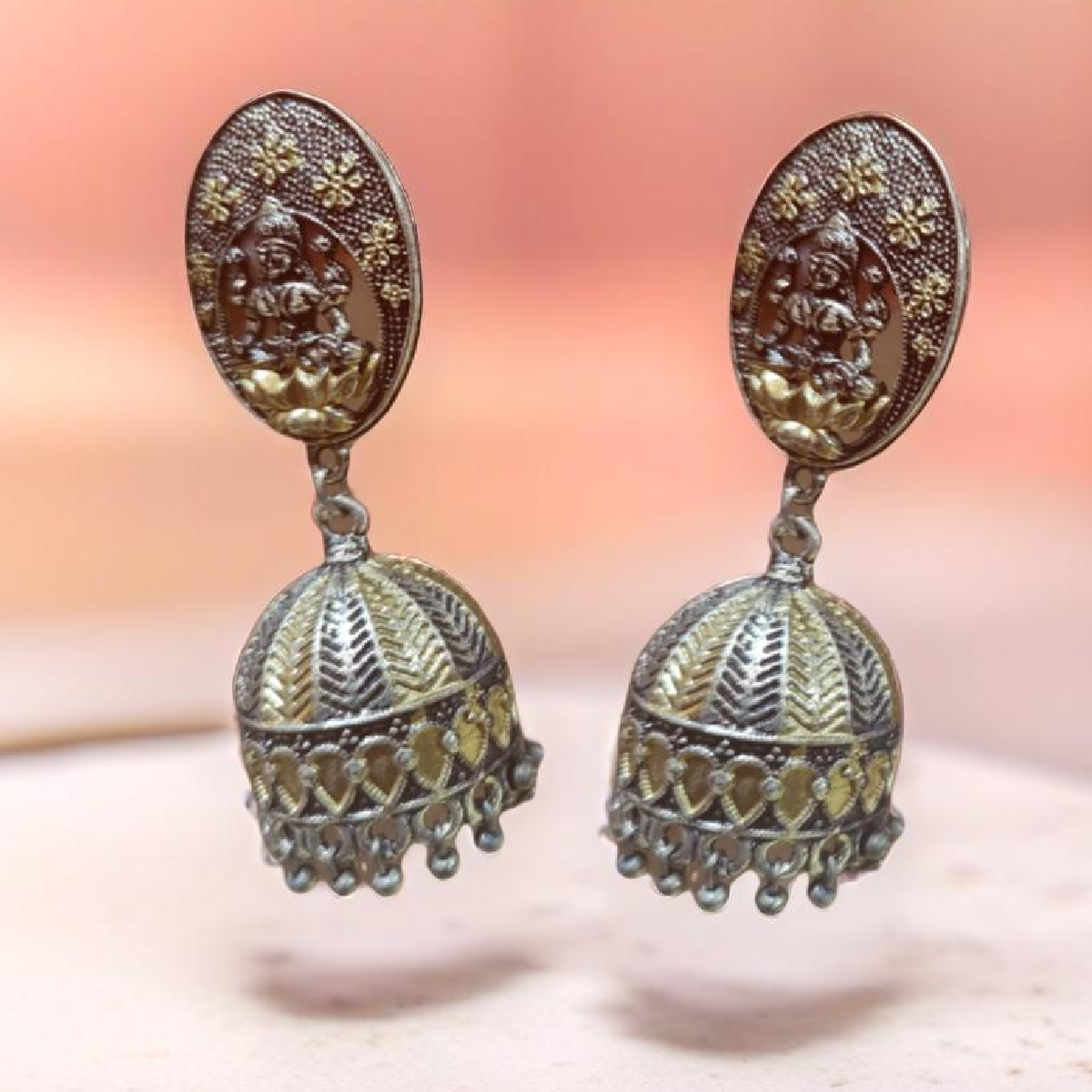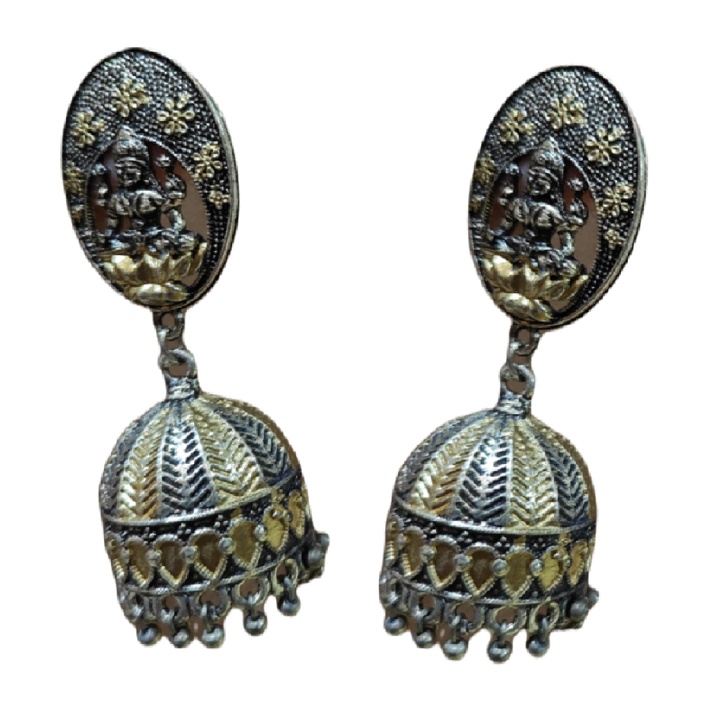 Double tone stylish oxidised dangler earrings with intricate temple carving in jhumki style. The jhumkas feature an ornate stud connected to a dome shaped drop decorated with delicate ghungroos at the bottom. The vintage look of the Jhumkis make them a decent match with traditional attire.