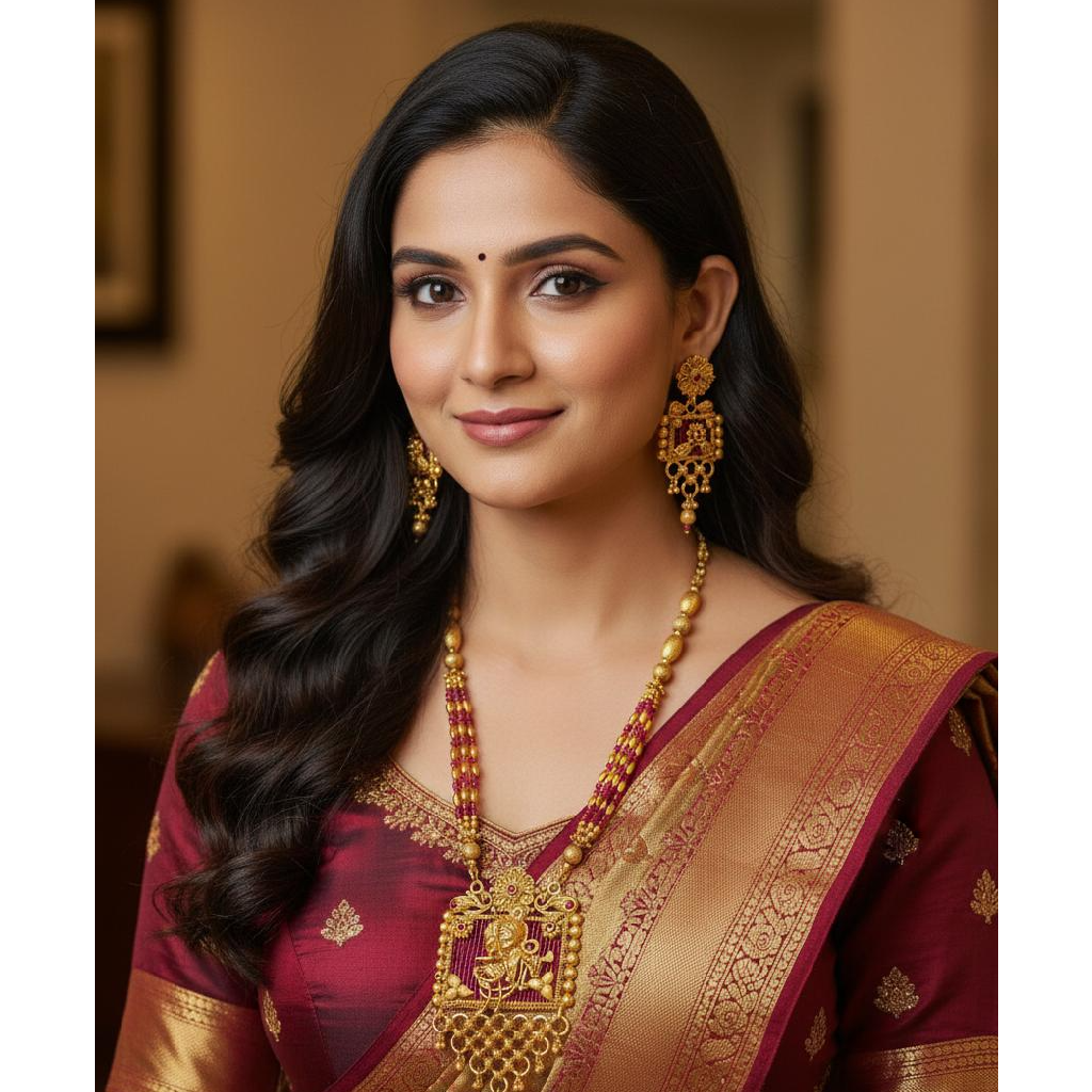 - Set Includes: One long necklace (mala) with a large pendant and a pair of matching earrings.