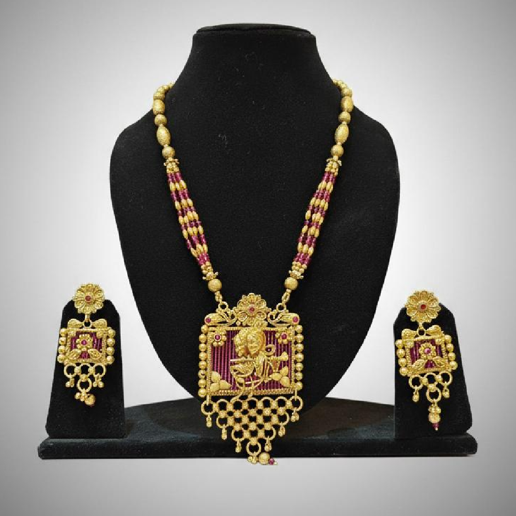 This jewelry piece is a Radha Krishna Necklace Set with Temple Pendant and multi strand chains in Pink and Golden beads.