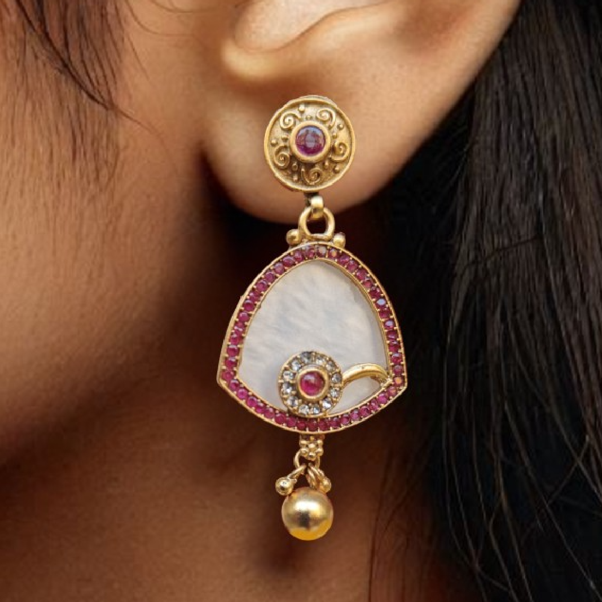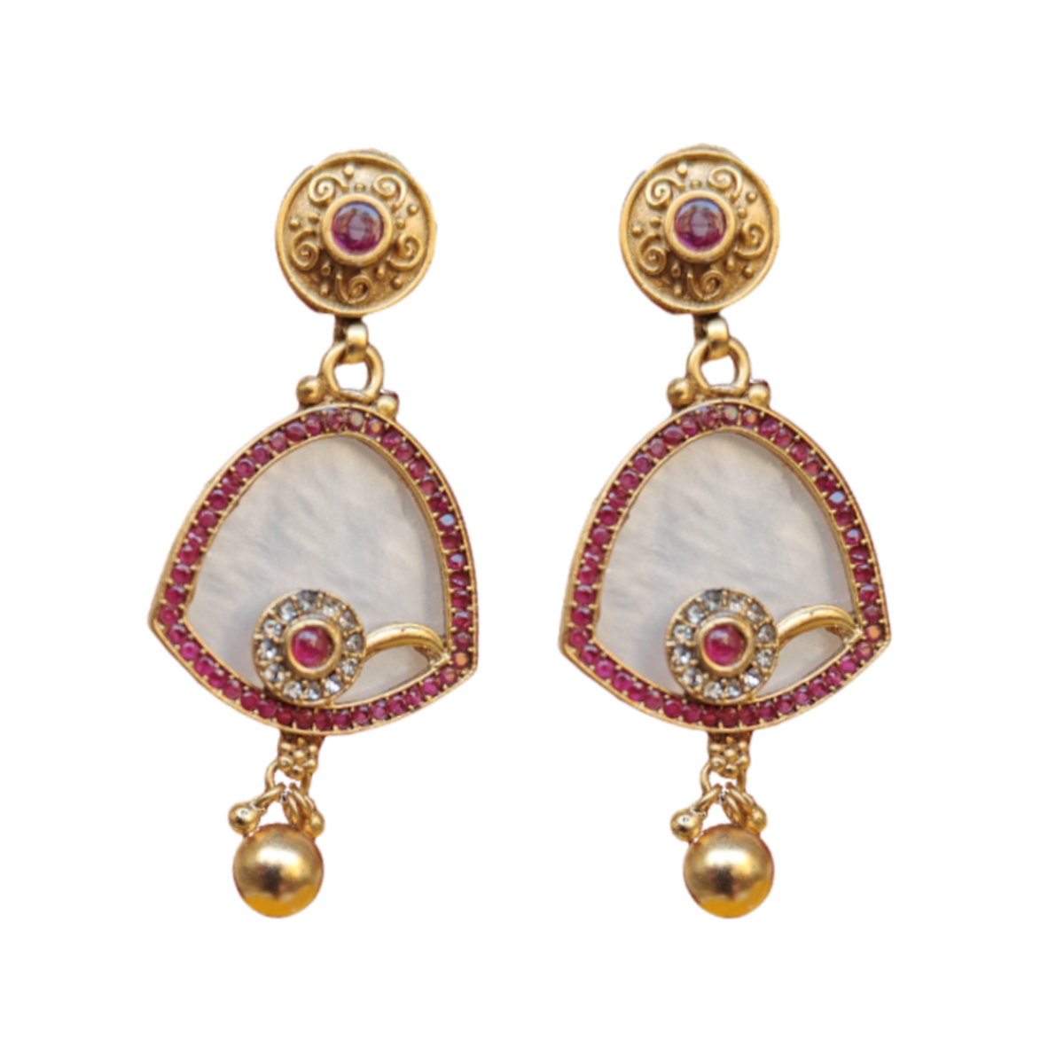 Stylish red stone danglers with ethnic look and pinkish red fine stone setting. Medium size Danglers.