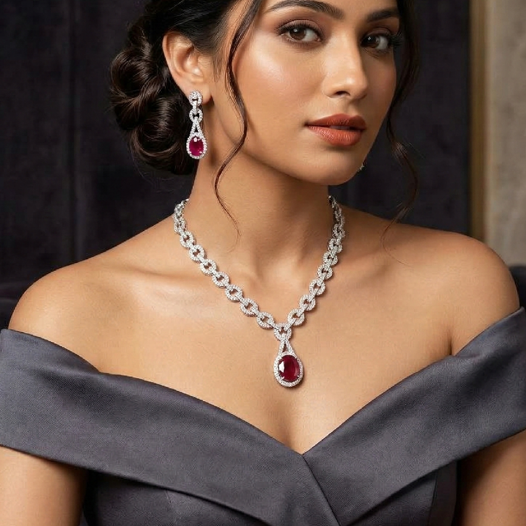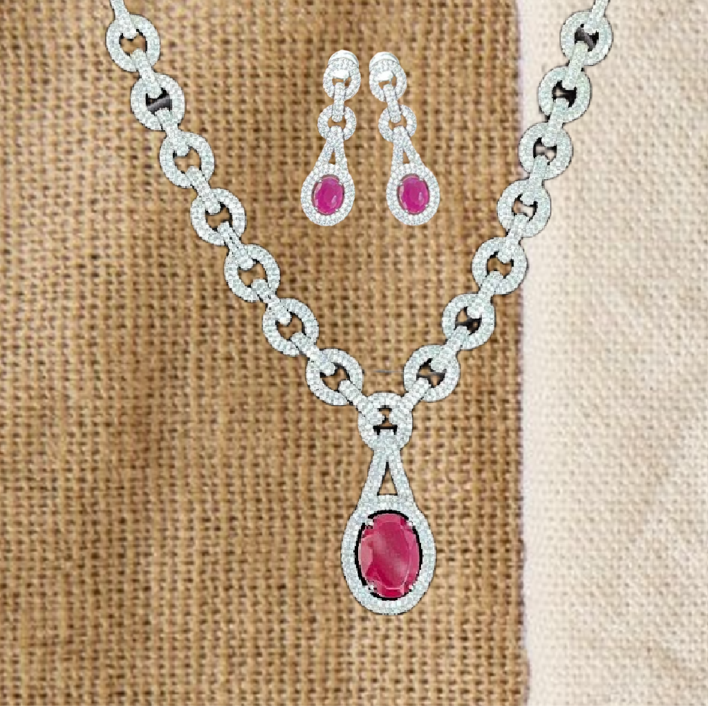 Stylish ruby stone AD necklace set (American Diamond). Fine stone setting in stunning finish. Suits western attire as well as traditional one.